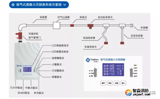 鑒于食品冷鏈火災特點及使用環(huán)境,適合采用吸氣式感煙火災探測器,由于冷庫的內(nèi)外溫差較大,極易產(chǎn)生冷凝水及結(jié)冰,所以對于冷庫消防探測器的設計及現(xiàn)場探測主機安裝工藝的要求顯得極為關(guān)鍵。